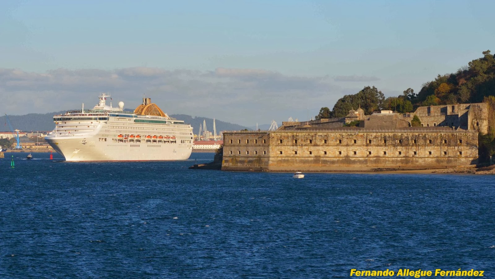 | Crucero Oceana saliendo de Ferrol, a la derecha Castillo de La Palma, foto de Fernando Allegue. |